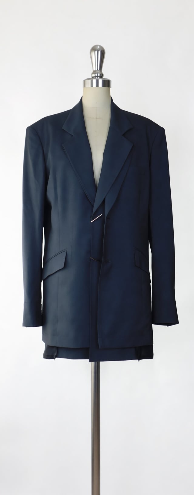 super160'sのサマーウールで作った薄手のダークグレーのジャケット。 前端~裾がレイヤードのふらし構造になっており、より軽さを感じられるデザイン。 (肩パッド、裄綿入り構造) 組成 表地:毛100% 裏地:ポリエステル100% (手洗い可能) サイズ 着丈:80.5cm 肩幅:48cm 身幅:114cm 袖丈:65cm 縫製:日本製